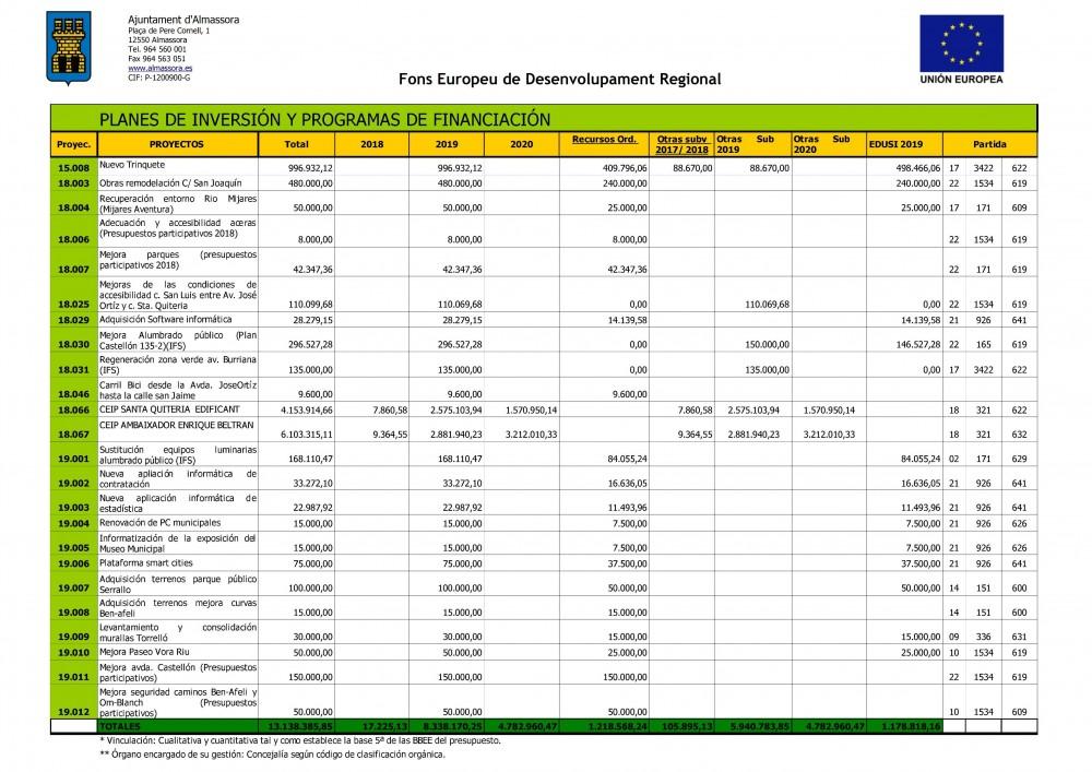 “Més de set milions d'euros en subvencions confirmen que hem fet el treball que se'ns demanava, que Almassora compleix els requisits que ens demanen les institucions per a concedir-nos les ajudes i que 2019 serà un any de grans inversions”, ha defensat l'alcaldessa, Merche Galí. En aquest sentit, Galí ha recordat que les inversions en obra pública, a més de transformar la localitat, suposaran “un revulsiu per a les empreses dedicades a la construcció i auxiliars, que tant van patir els efectes de la crisi econòmica”.