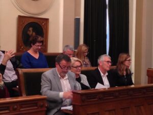 Y Mulet continuó en el mismo tono: “Usted también es inteligente y guapa”. Más risas mientras otro concejal decía a media voz: ¡que paguem la llum!.
