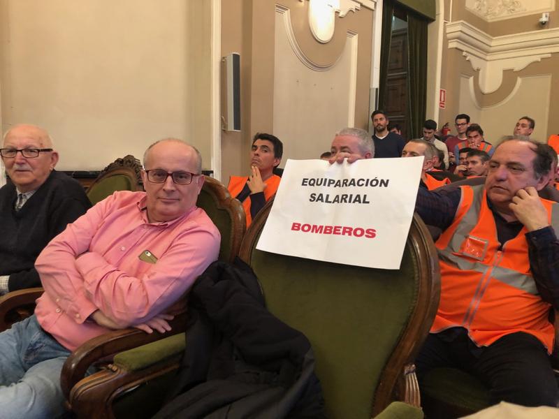 Si el lunes fueron los Policías Locales del GIP, los que llenaron el pleno para solicitar atención a sus reivindicaciones laborales, en este pleno fueron los Bomberos, ataviados con chaleco naranja los que exigieron sus derechos y llenaron el salón hasta la bandera.