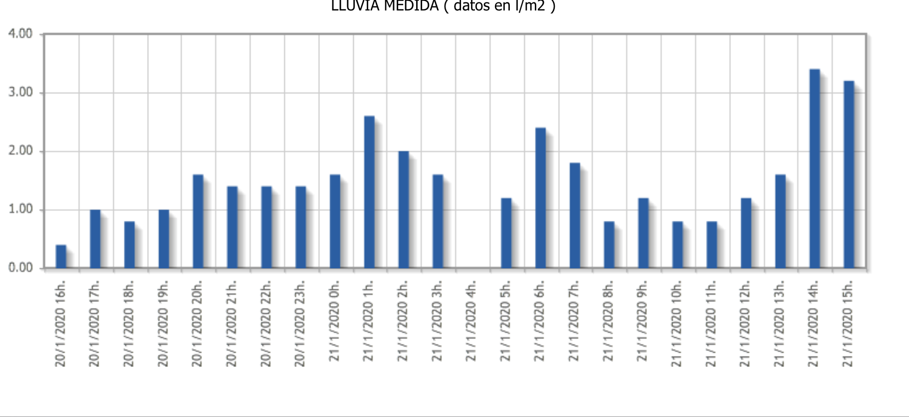 El pic més alt de precipitacions s'ha aconseguit entre les 14.00 i les 15.00 hores d'aquesta vesprada, amb prop de 3,5 litres per metre cuadra. En l'última hora s'han acumulat, 0,8 l/m2, 9,4 en les últimes quatre hores i 35,6 l/m2 en les darreres 24.