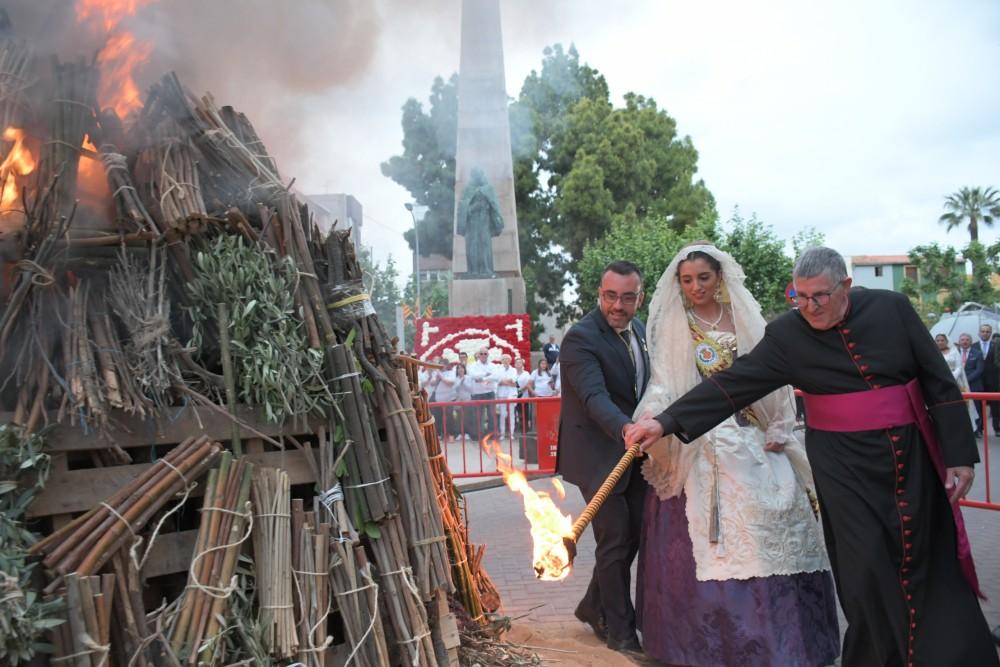 Una multitudinària ofrena de flors i la tradicional foguera de Sant Pasqual, que han encés l'alcalde de la ciutat, José Benlloch, i la reina de festes, Carmen Rubert, han anunciat a Vila-real l'arribada del dia gran de les festes patronals, el dia de Sant Pasqual, que serà demà.