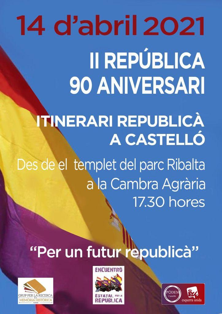 Podem-Esquerra Unida Castelló ha organitzat per a aquest dimecres 14 d'abril un itinerari republicà per a commemorar el 90 aniversari de la proclamació de la II República i reivindicar “els valors de la igualtat, solidaritat i llibertat”.
