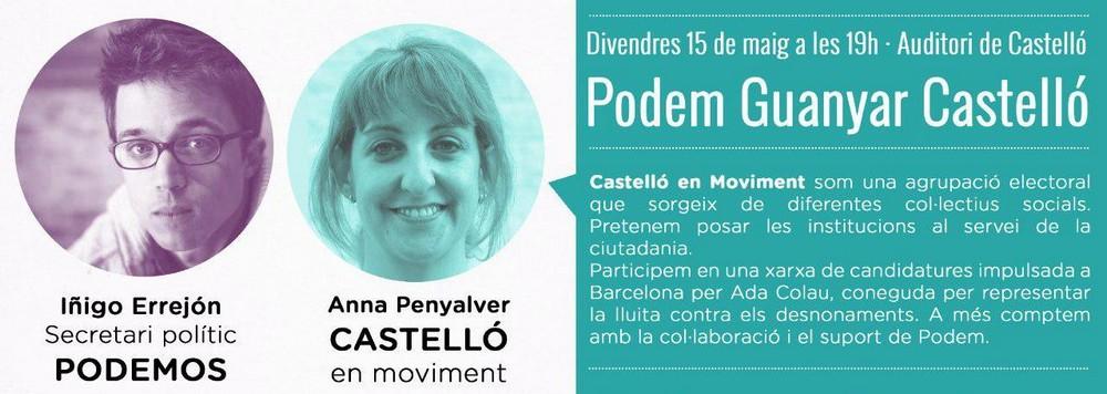 Podemos, que se presenta con candidatura propia a las autonómicas y avala para las municipales a Castelló en Moviment, ha invitado a la candidatura local al acto, como reconocimiento a su labor en la ciudad castellonense, la única capital de provincia del País Valencià en la que concurre una agrupación de electores.