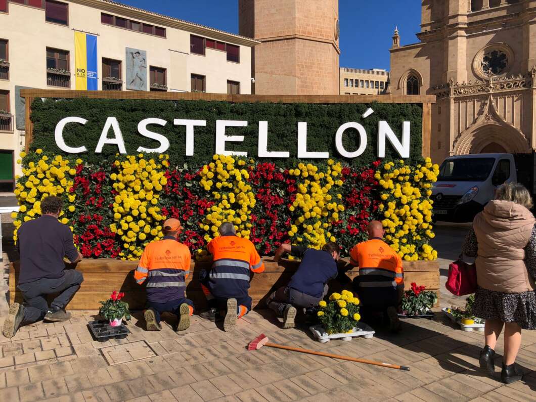 El 'polémico' tapiz floral se instala en plena plaza Mayor con doble letrero: Castellón y Castelló
