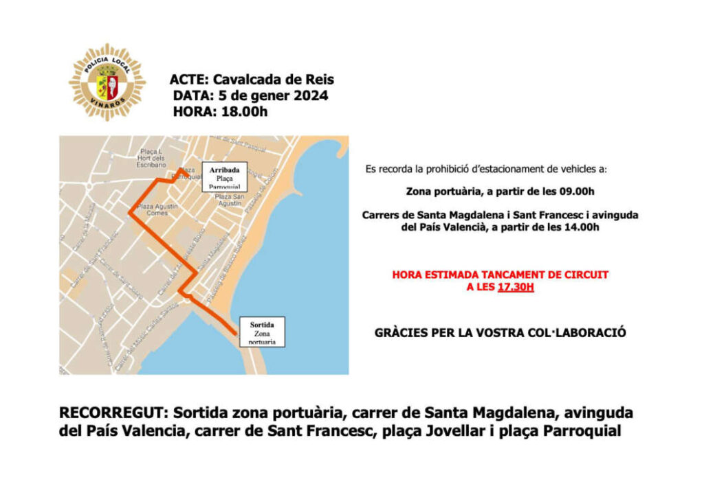 Asimismo, desde la dos estará prohibido estacionar en las calles por donde discurrirá la misma: Santa Magdalena en el tramo que va desde la rotonda del puerto a la avenida del País Valencià, así como en toda esta avenida, la calle de San Francisco estará cortada en el tramo que va desde la avenida del País Valencià hasta la calle de la del Pilar.