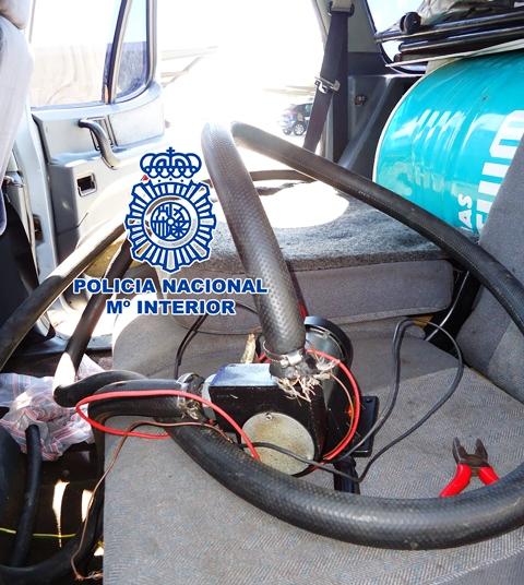 Tras identificarles, los agentes inspeccionaron el coche, que desprendía un fuerte olor a Gasoil, encontrando camuflado entre chatarra, un novedoso y eficiente sistema para sustraer gasoil, que constaba de una bomba, con una manguera conectada directamente a un bidón de gran capacidad, y el otro que sería el que se introduciría en los tanques de los que extraerían en gasoil.