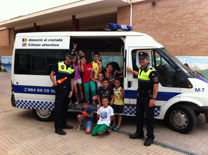 La Policía de Proximidad de la Vall d'Uixó se ha acercado esta mañana a l'Escola d'Estiu que acogen los colegios Ausiàs March, Eleuterio Pérez y Blasco Ibáñez durante el periodo estival.