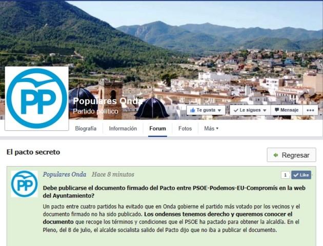 Ya han creado un foro en su página de facebook para que los ondenses expresen sus opiniones en torno a la gestión municipal y puedan ser trasladadas al pleno del Ayuntamiento