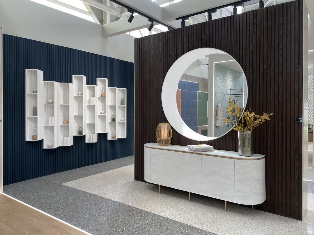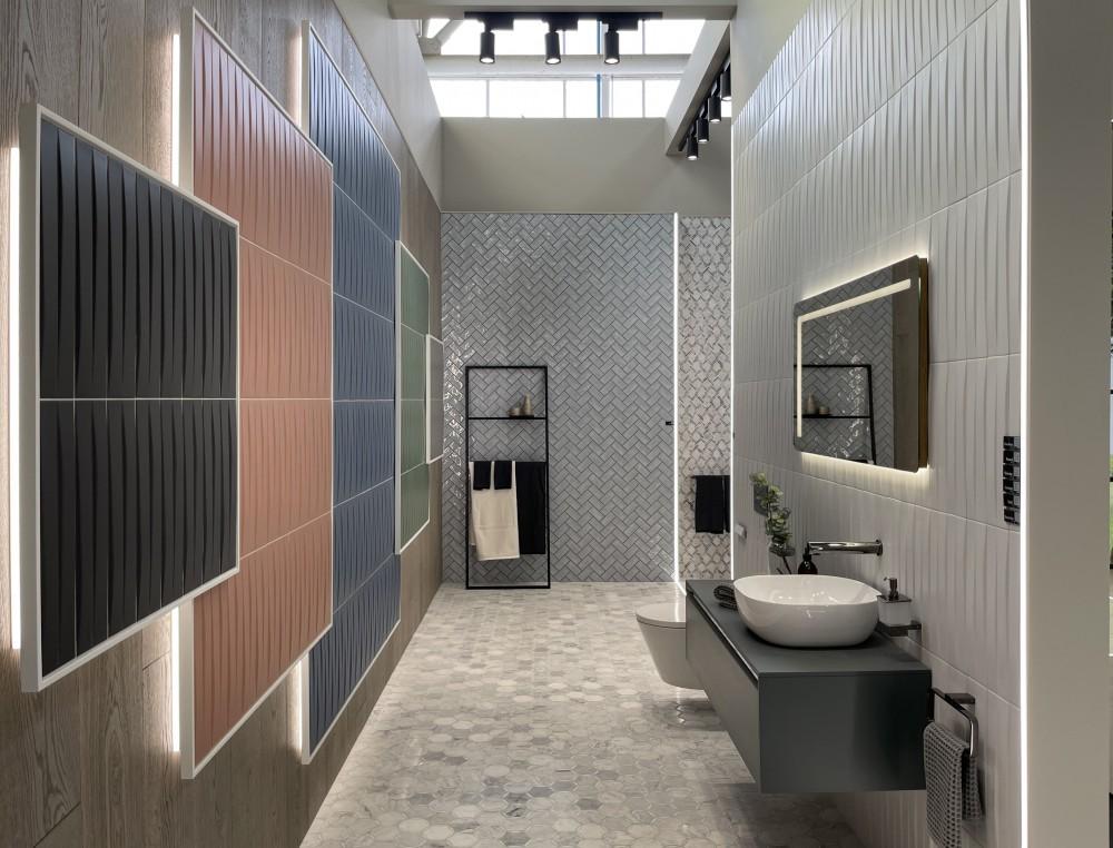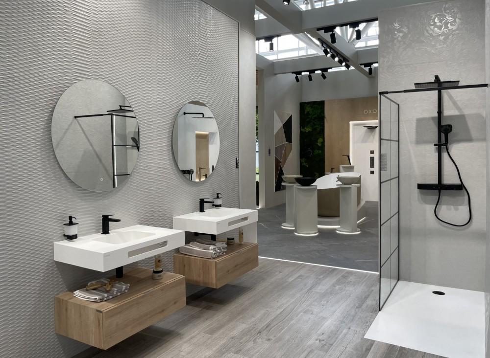 Formado por una fachada de Krion® Lux, una recepción construida con el nuevo porcelánico técnico Stratos (Solidker) que enmarca el Video Wall y da paso a las 12 estancias (11 baños y una cocina-salón), este espacio de 400 metros cuadrados combina las colecciones naturales de L’Antic Colonial con los equipamientos de Noken o los sofás de Gamadecor. Se trata de una superficie multidisciplinar donde las zonas de diseño conviven con aquellas destinadas únicamente a producto. Es el caso del área de Krion, estructurada por los paneles decorativos y sostenibles Fitwall®. Estas piezas verticales de composición mineral reproducen la textura del cemento, el textil, el barro cocido o la madera y se pueden utilizar en paredes o mobiliario. Por su parte, Noken presentará el concepto Finish Studio en lavabos, bañeras, platos de ducha y griferías. En sus acabados especiales predominan los colores neutros y metalizados para personalizar cada baño.