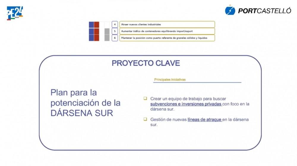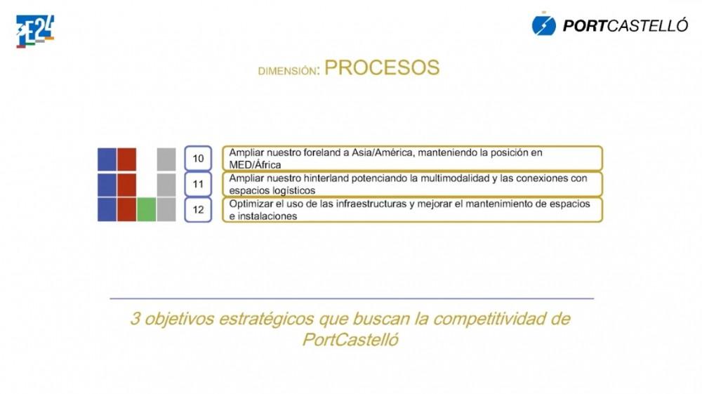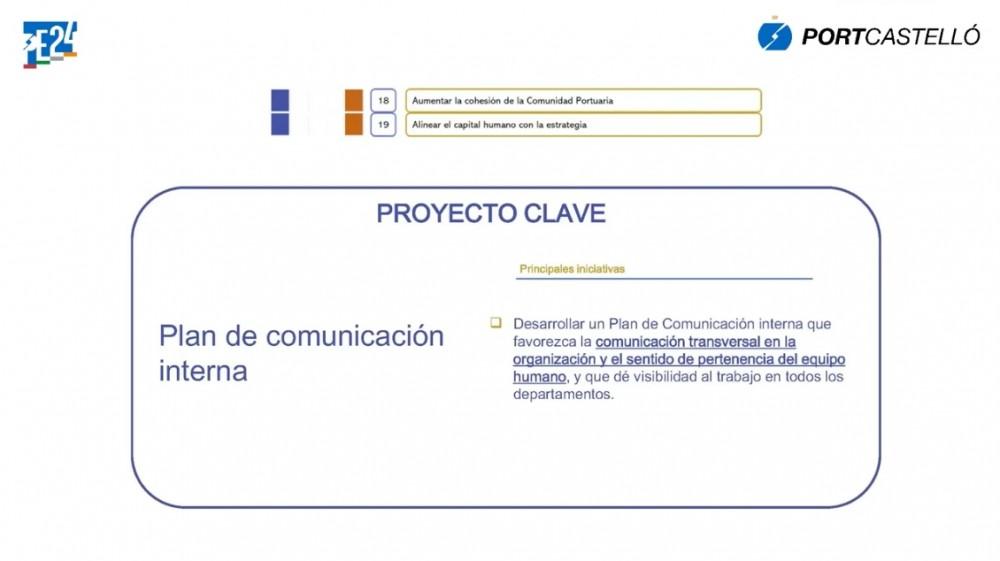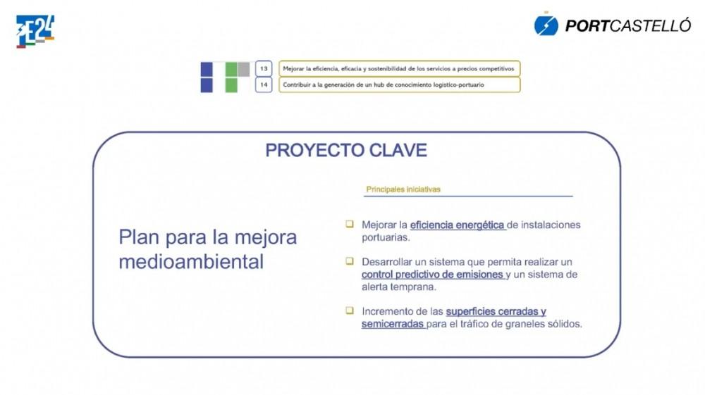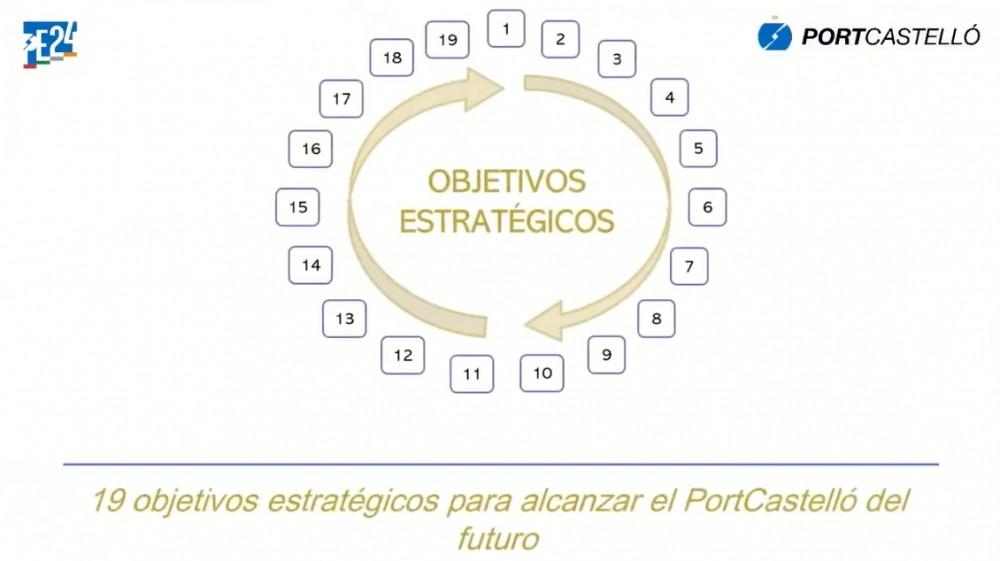 Estas líneas estratégicas se despliegan en 19 objetivos para, en esencia, posicionar a PortCastelló entre los mejores conectados del sistema portuario español, a la vanguardia tecnológica, medioambiental y social, y servirán de trampolín para la ampliación de sus conexiones marítimas, el desarrollo de la nueva zona logística, la optimización de la dársena norte y el despegue definitivo de la dársena sur.