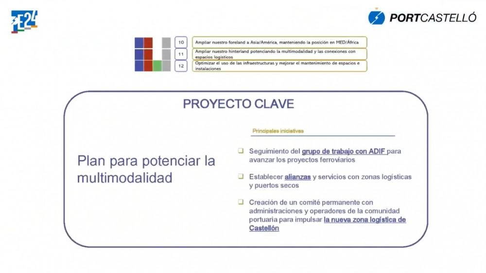 Para alcanzar estos objetivos se ha diseñado un plan que potencia la multimodalidad mediante iniciativas como el seguimiento del grupo de trabajo con ADIF para avanzar los proyectos ferroviarios, el establecimiento de alianzas con zonas logísticas y puertos secos y la creación de un comité permanente con administraciones y operadores de la comunidad portuaria para impulsar la nueva zona logística de Castellón.