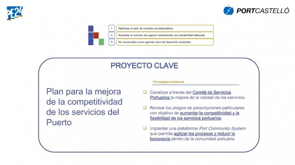 En definitiva, emprender un plan de mejora de la competitividad de los servicios de PortCastelló a través del Comité de Servicios Portuarios, revisando los pliegos de prescripciones particulares para aumentar la competitividad y la flexibilidad de los servicios portuarios e implantando la plataforma Port Community System para agilizar los procesos y reducir la burocracia dentro de la comunidad portuaria.