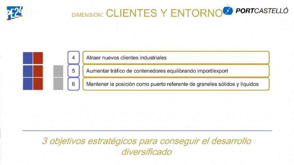 El #PE24 dará respuesta a los sectores productivos y sus clientes del puerto de Castellón, consolidará su papel motor económico del entorno y generación de riqueza, y lo situará "como espacio al servicio de sociedad en la que vivimos y con la que convivimos", ha indicado. Para ello despliega 19 objetivos integrados en cinco líneas estratégicas para el futuro de PortCastelló.