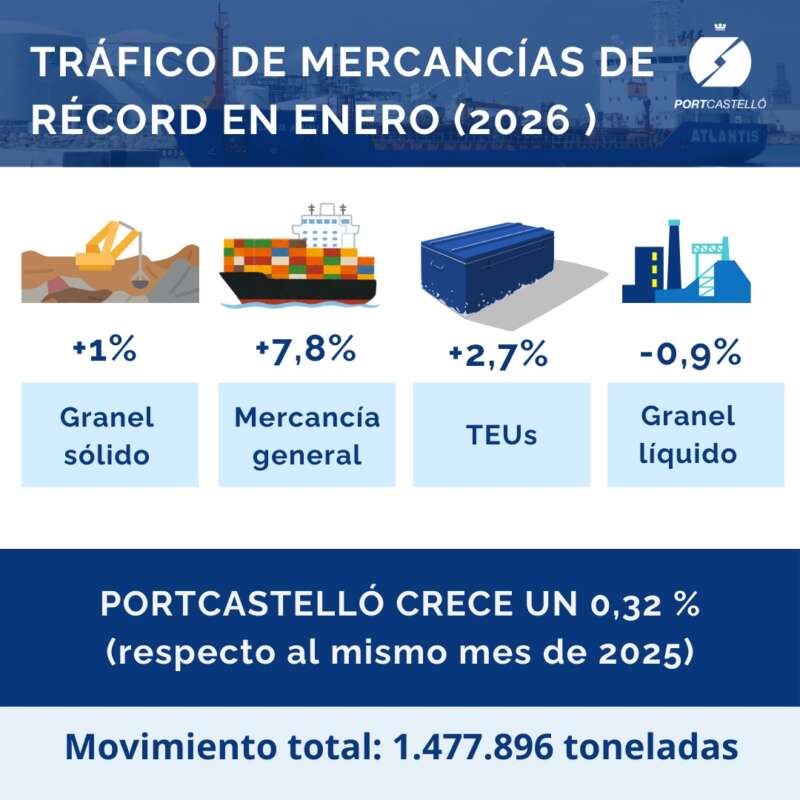 PortCastelló sigue creciendo en tráfico de mercancías también en 2026. Así, durante el mes de enero el puerto de Castellón ha movido un total de 1.477.896 toneladas, lo que supone un incremento del 0,3% respecto al mismo mes del año anterior. Este resultado viene impulsado especialmente por el buen comportamiento de la mercancía general y los graneles sólidos.