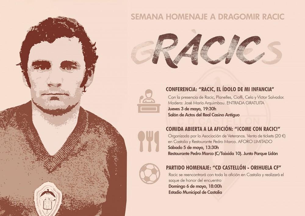 El sábado 5 de mayo, a las 13.30 horas, el Restaurante Pedro Marco (C/Taixida 10) será el escenario de "¡Come con Racic!" una comida organizada por la Asociación de Veteranos del CD Castellón abierta a la afición donde cualquier 'orellut' podrá conocer más de cerca a esta leyenda. Los tickets para asistir a la comida tienen un precio de 20€, y se podrán adquirir de lunes a viernes en La Tenda Albinegra de Castalia (de lunes a viernes de 10 a 14h y de 17 a 20h) y también en el propio Restaurante Pedro Marco (de martes a domingo de 13 a 16h y los viernes y sábados también por la tarde de 20.30 a 23h).