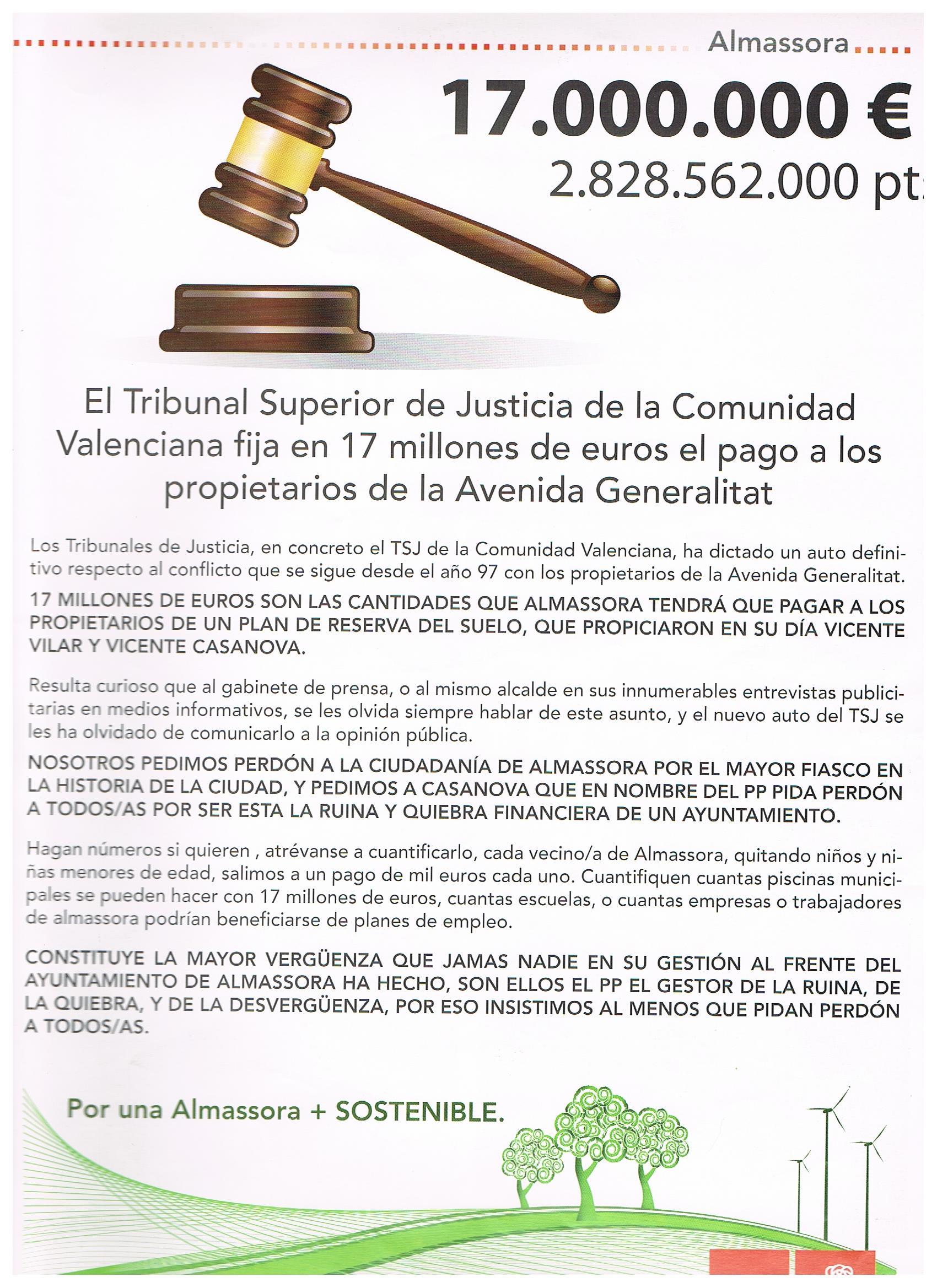 El Ayuntamiento de Almassora pagará este año la minuta de los letrados que defendieron la causa en los tribunales. Un importe de 178.000 euros que permitió que el municipio pagara la mitad de los 17 millones que el PSPV anunciaba en abril de 2011 que pagaría el municipio. Su boletín "Arguments Socialistes" advertía de una bancarrota inminente y de un pago multimillonario que no fue tal.