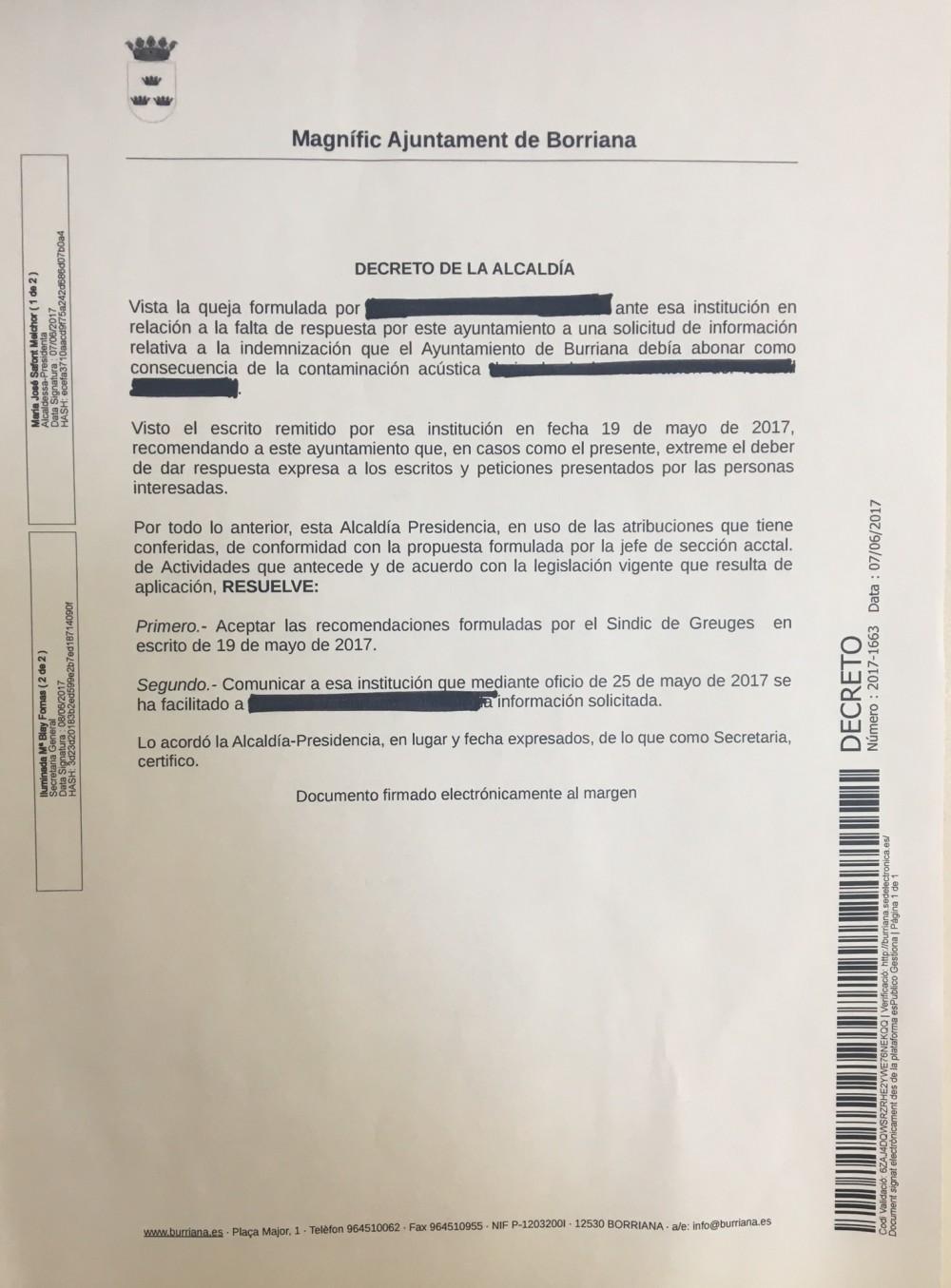 Un veí de Borriana ha hagut de recórrer al Síndic de Greuges davant la falta de resposta a una sol•licitud d'informació relativa a la indemnizació que l'Ajuntament va haver d'abonar a un afectat com a conseqüència de la contaminació acústica derivada.