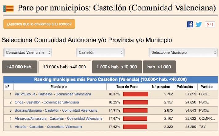 Amb un 17,67% de taxa de desocupació, Almassora ocupa el quart lloc en el rànquing de municipis de la província de Castelló amb major taxa d'aturats. Cal assenyalar que les ciutats amb major taxa d'atur estan governades per l'esquerra, com és el cas de la Vall d'Uixó, Onda i Borriana.