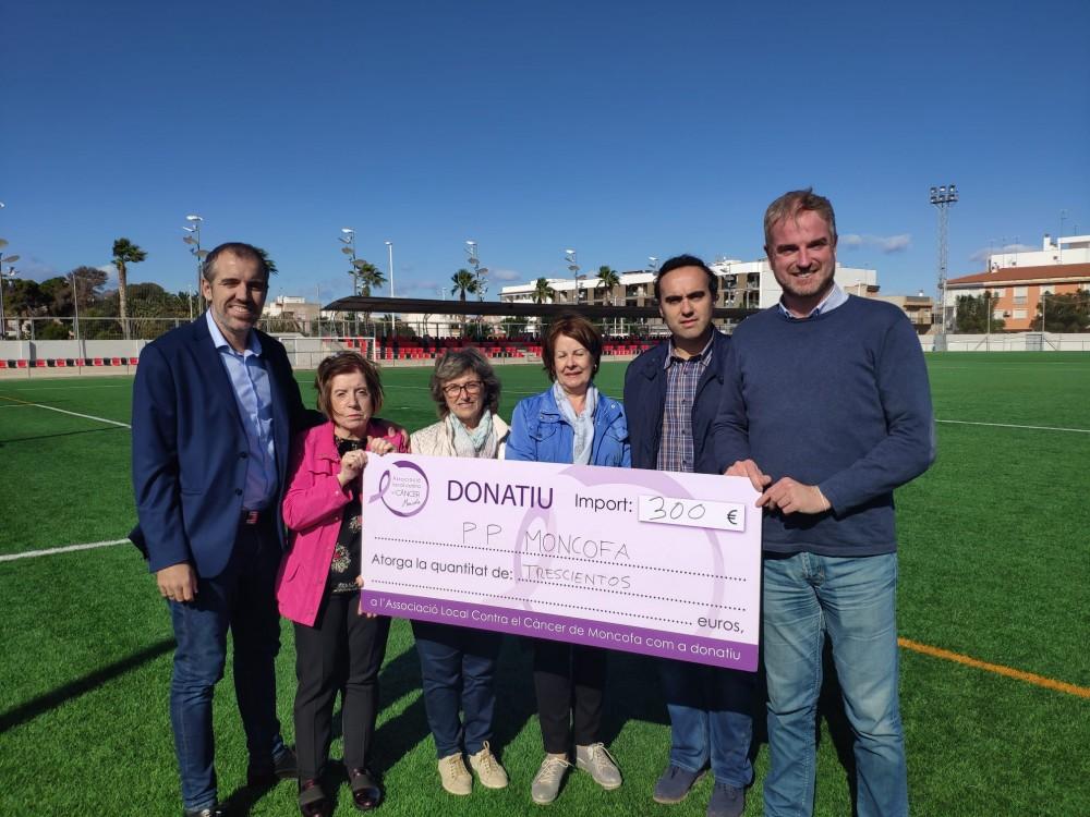 El Partido Popular de Castellón ha hecho entrega hoy del dinero recaudado en el partido de fútbol solidario que se celebró el pasado 27 de octubre. Los candidatos nacionales junto al alcalde de Moncofa, Wences Alós, han entregado el dinero recaudado a la Asociación Española Contra el Cáncer de Moncofa.