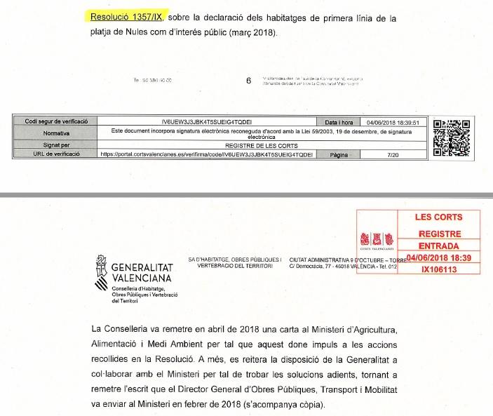 El Consell ha reconegut que després de recolzar al PP en la seua demanda per a protegir aquestes casetes, la seua única acció va ser la de remetre l'abril passat una carta al Govern d'Espanya perquè “aquest done l'impuls de les accions arreplegades en la resolució”. “Esperàvem que la mesura provocara una mica més que simplement limitar-se a escriure un escrit al Ministeri de Medi Ambient. Perquè per a fer aqueix tràmit feia falta ben poc”.