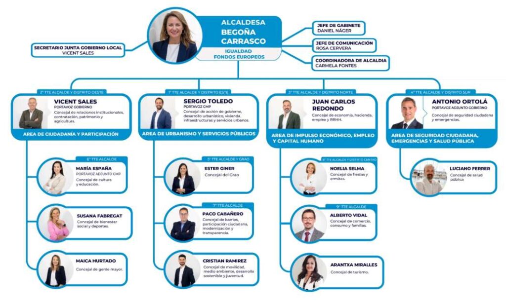 El nuevo gobierno de 15 concejales se distribuye en cuatro grandes áreas,a las tres que ya había (área de Ciudadanía y Participación, área de Urbanismo y Servicios Públicos y área de Impulso Económico, Empleo y Capital Humano), se suma la de Seguridad, Emergencias y Salud Pública, que va a llevar Antonio Ortolá, quien también será el concejal de este área. Y de ésta se desprende la concejalía de Salud Pública, que estará dirigida por Luciano Ferrer, de VOX.