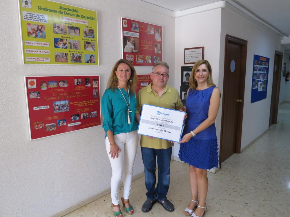 La portavoz popular, Begoña Carrasco, y la concejala Salomé Pradas visitaron la Asociación Síndrome de Down Castellón para hacerles entrega de un donativo de 500 euros, correspondientes al sueldo que percibe Pradas como edila en el Ayuntamiento.