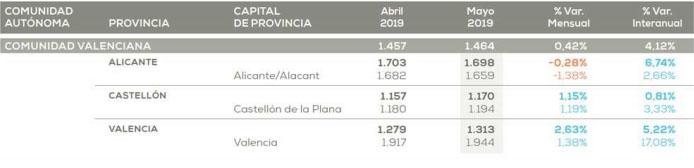 El precio de la vivienda en la Comunidad Valenciana sube un 4,12% frente al año pasado. La vivienda en la Comunidad Valenciana en mayo de 2019 tuvo un precio medio de 1.464 euros por metro cuadrado, subiendo un 0,42% frente al mes de abril. La capital de Valencia (17,08%) fue la undécima que más subió del país de un año a otro, mientras que Castellón de la Plana (3,33%) y Alicante (2,66%) arrojaron repuntes contenidos.