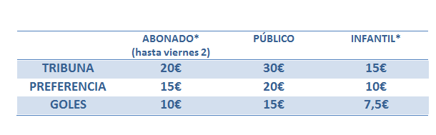 El Castellón da a conocer los precios oficiales para el segundo partido de la promoción de ascenso a Segunda B, que el conjunto albinegro disputará este fin de semana y que no entrará en el abono de temporada que únicamente engloba la liga regular. Abonados: el precio para abonados se mantendrá hasta el viernes 2 de junio. Con cada entrada de abonado que se retire hasta el viernes, el abonado recibirá dos invitaciones infantiles.
