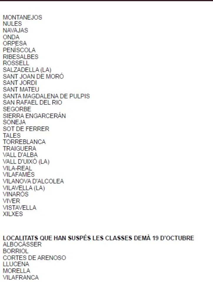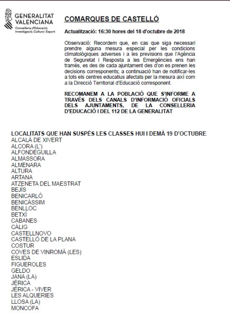 Desde la Generalitat Valenciana han informado esta mañana  que las localidades en las que se suspenden las clases a partir de las 13 horas de hoy son:  Alcalà de Xivert, l'Alcora, Almassora, Benicarló, Betxí, Càlig, Castelló de la Plana, les Coves de Vinromà, Moncofa, Nules, Onda, Peníscola, Sant Jordi, Segorbe, Torreblanca, Traiguera, la Vall d'Alba, la Vall d'Uixò, la Vilavella, Vilafamés y Vinaròs. Además, La Llosa, Sant Mateu y Vila-real han suspendido la jornada de este jueves completa. Aproximadamente 75.000 alumnos se han visto afectados.