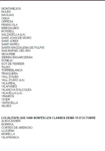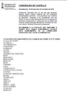 Desde la Generalitat Valenciana han informado esta mañana que las localidades en las que se suspenden las clases a partir de las 13 horas de hoy son: Alcalà de Xivert, l'Alcora, Almassora, Benicarló, Betxí, Càlig, Castelló de la Plana, les Coves de Vinromà, Moncofa, Nules, Onda, Peníscola, Sant Jordi, Segorbe, Torreblanca, Traiguera, la Vall d'Alba, la Vall d'Uixò, la Vilavella, Vilafamés y Vinaròs. Además, La Llosa, Sant Mateu y Vila-real han suspendido la jornada de este jueves completa. Aproximadamente 75.000 alumnos se han visto afectados.