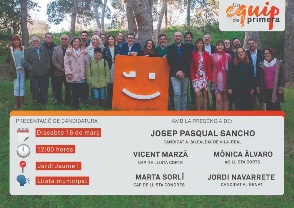 El jardí de Jaume I serà escenari aquest dissabte, 16 de març, a partir de les 12.00 hores, de l'acte de presentació oficial de candidatura de Compromís per Vila-real per a les pròximes eleccions municipals del 26 de maig. Un acte en el qual el candidat a l'alcaldia, Josep Pasqual Sancho, estarà abrigallat per les 24 persones que formen el seu #EquipdePrimera i per diferents representants i candidats de Compromís a nivell autonòmic i estatal.