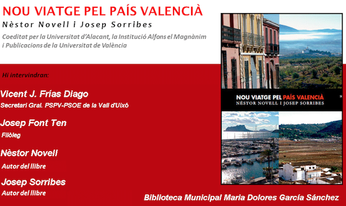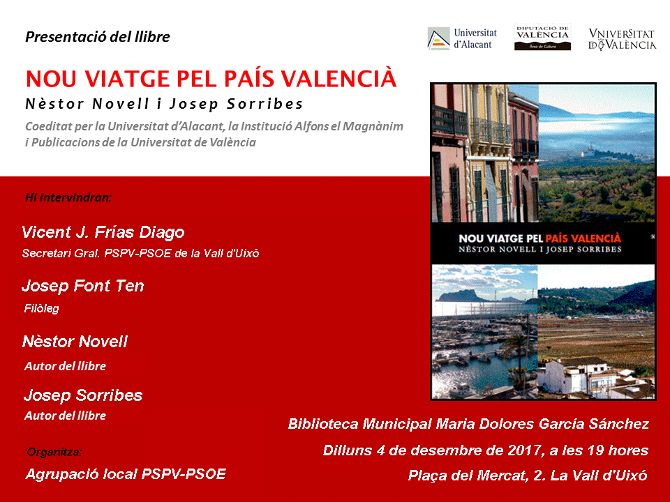 Invitació pres. Nou Viatge PV. La Vall. 04.12.17El pròxim dilluns dia 4 de desembre, a les 19 hores, es presentarà el llibre ‘Nou viatge pel País Valencià’, de Nèstor Novell i Josep Sorribes, a la Biblioteca Municipal. “És un llibre d'interès per a entendre el passat, el present i el futur del nostre territori, ja que en el mateix s'apunten pinzellades de treball per als propers anys”. En la mateixa biblioteca es podran adquirir exemplars eixe dia. Per a l'acte comptarem amb la introducció del filòleg Josep Font, que ha estat corrector del llibre i la pròpia participació dels autors.