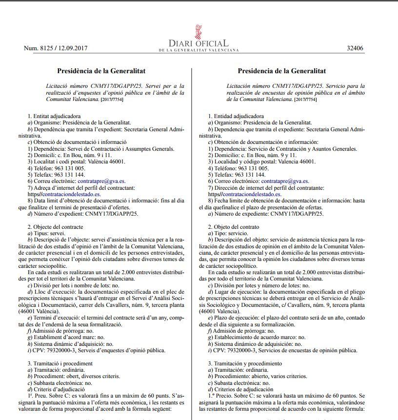 Hoy se ha publicado en el Diari Oficial de la Generalitat Valenciana (DOGV) la licitación de un concurso para la realización de dos encuestas sobre temas sociopolíticos en el ámbito de la Comununitat. El presupuesto licitado para el mismo asciende a 118.580€ incluyendo el 21% de IVA. Dicho concurso está convocado por el departamento de Presidencia y serán de carácter presencial realizados en el domicilio de las personas entrevistadas, para conocer la opinión de los ciudadanos sobre los temas de dicha índoles. En las bases del estudio se contempla que cada uno de ellos deberá realizarse a 2.000 personas distribuidas por todo el territorio de la Comunitat Valenciana. En el siguiente enlace está disponible el acceso a las bases publicadas en el DOGV. El plazo de ejecución será de un año.