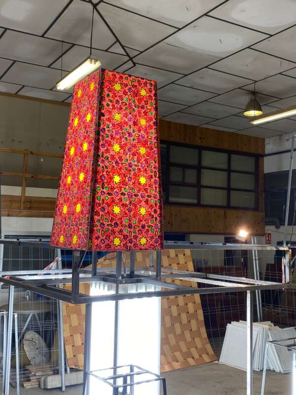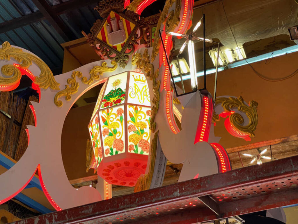 Los motivos: La combinación de materiales da unas posibilidades casi infinitas. Sin embargo, la mayor parte de las Gaiatas suelen utilizar diseños recurrentes que repiten un esquema usual: los brazos de madera en torno a un elemento central en el que se combinan los prismas de diferentes formas. En ese cuerpo central se introducen los elementos fundamentales que inspiran la Gaiata. En este 2024, la mayoría de ellas, rinden homenaje a la Verge de Lledó. Pero no todas.