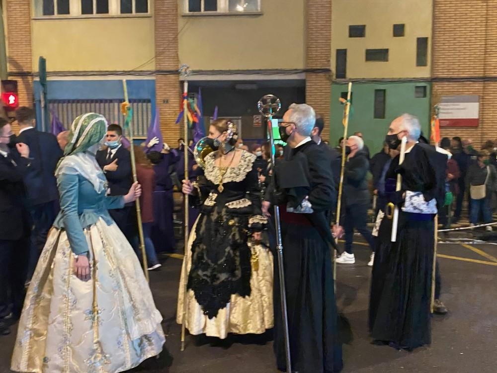 En el Forn del Pla formaban los penitentes bajo la dirección de la Cofradía de la Sangre. Las carrozas de las ‘caigudes’ de la Magdalena, estaban aparcadas en la calle Sanhuja.
