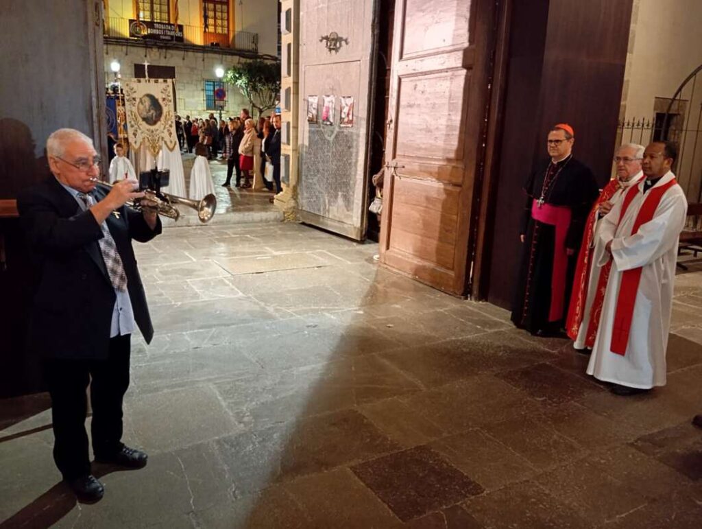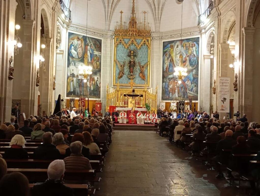 A su llegada a la arciprestal se iniciaba el pregón de Semana Santa, a cargo del Obispo de Tortosa, Sergi Gordo. En el mismo acto participó este año el Orfeó Vinarossenc, con el acompañamiento al órgano de Juan Vicente Alloza.