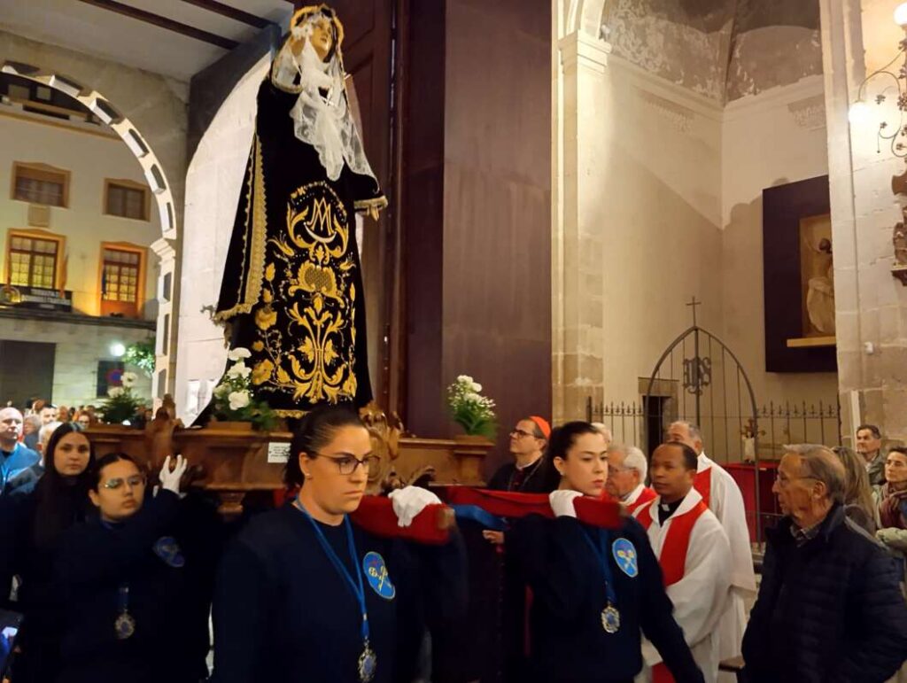 A las ocho y cuarto salía desde la iglesia Santa Magdalena la procesión de la Virgen de los Dolores, portada por cofrades de San Pedro hasta la iglesia arciprestal.