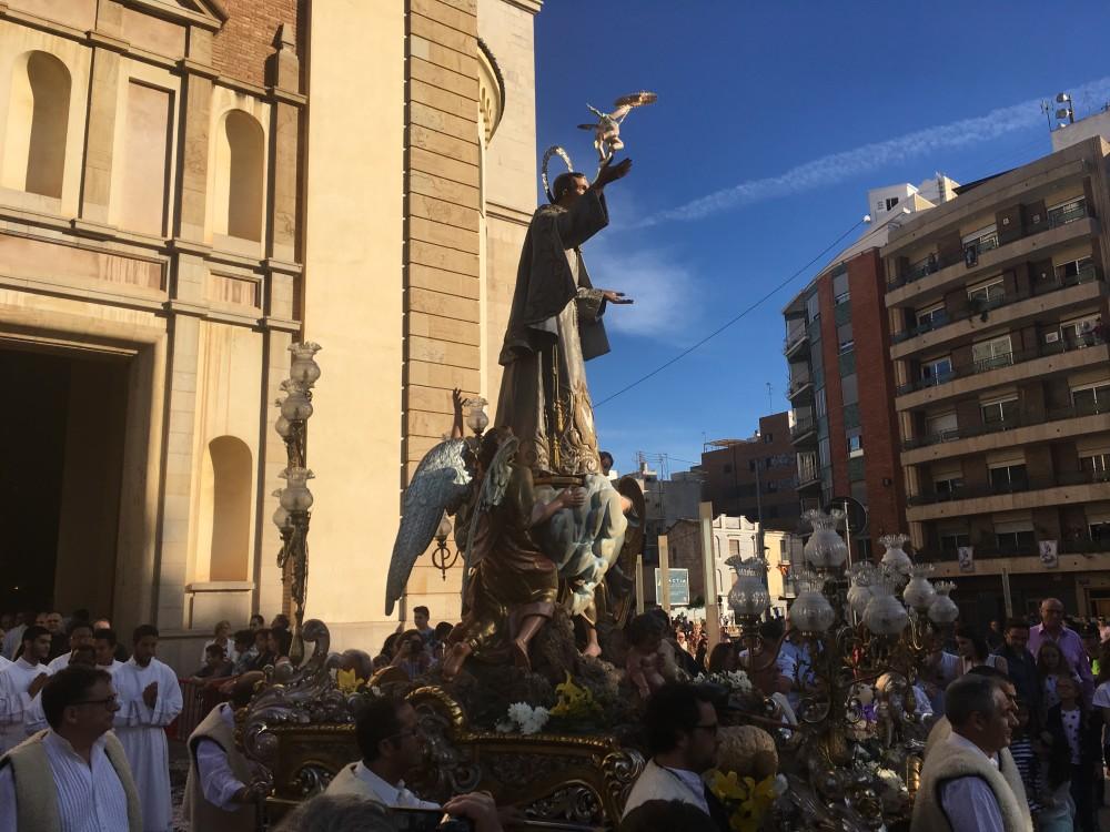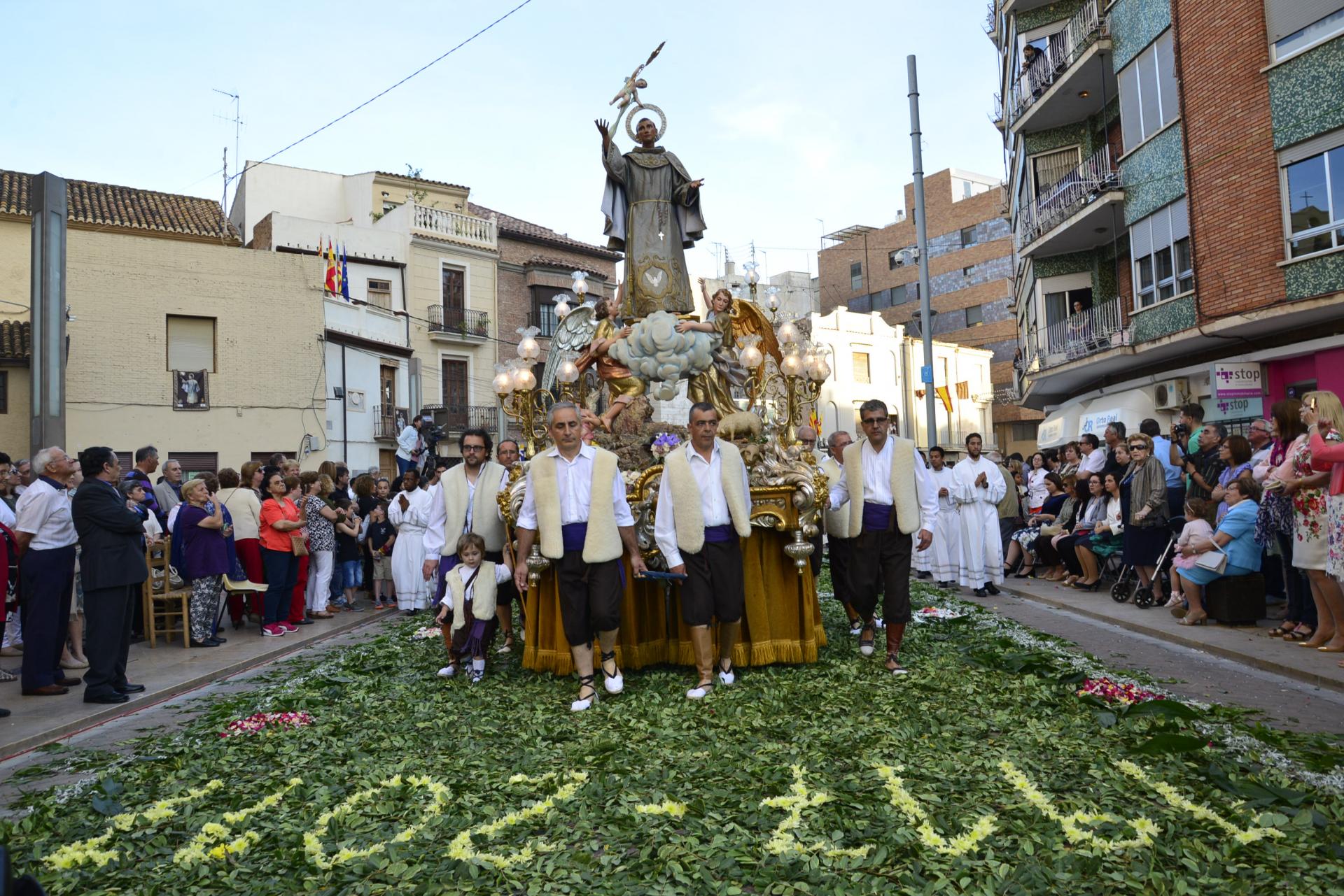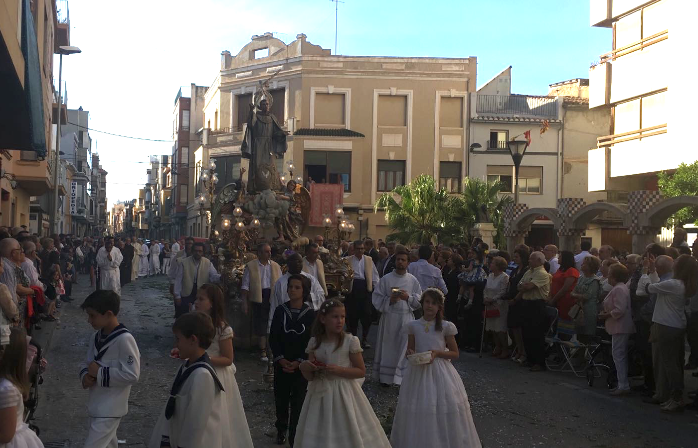 Confraries, entitats, congregacions, bandes de música i els xiquets i xiquetes que aquest any han pres la comunió, ha precedit a la figura del sant en la Processó i en la rereguarda la corporació municipal i la reina i les dames, que han tingut la sort de ser representants festeres en aquest any especial i inoblidable. Cal destacar, que la imatge del patró a estat a punt per aquest dia gràcies a la restauració portada a terme per l’IVC+R.