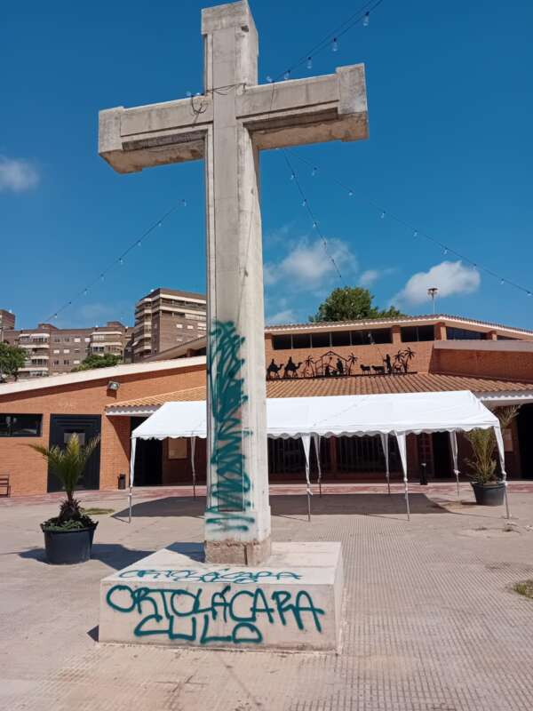 Aparte de no guardar ningún respeto contra el mobiliario urbano, esta vez los activistas tampoco han tenido reparo en profanar un símbolo religioso como es el de la Cruz latina que ahora se encuentra situada en un espacio privado, la Parroquia de Santo Tomás de Villanueva en Rafalafena.