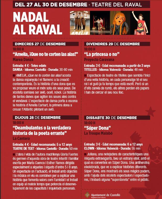 La Regidoria de Cultura, encapçalada per la regidora Verònica Ruiz, ha programat una nova edició del Nadal al Raval amb quatre propostes culturals. Del dimecres 27 al 30 de desembre, a les 18.00 hores, el Teatre del Raval serà l’escenari d’espectacles de dansa, titelles, clown i teatre de text.