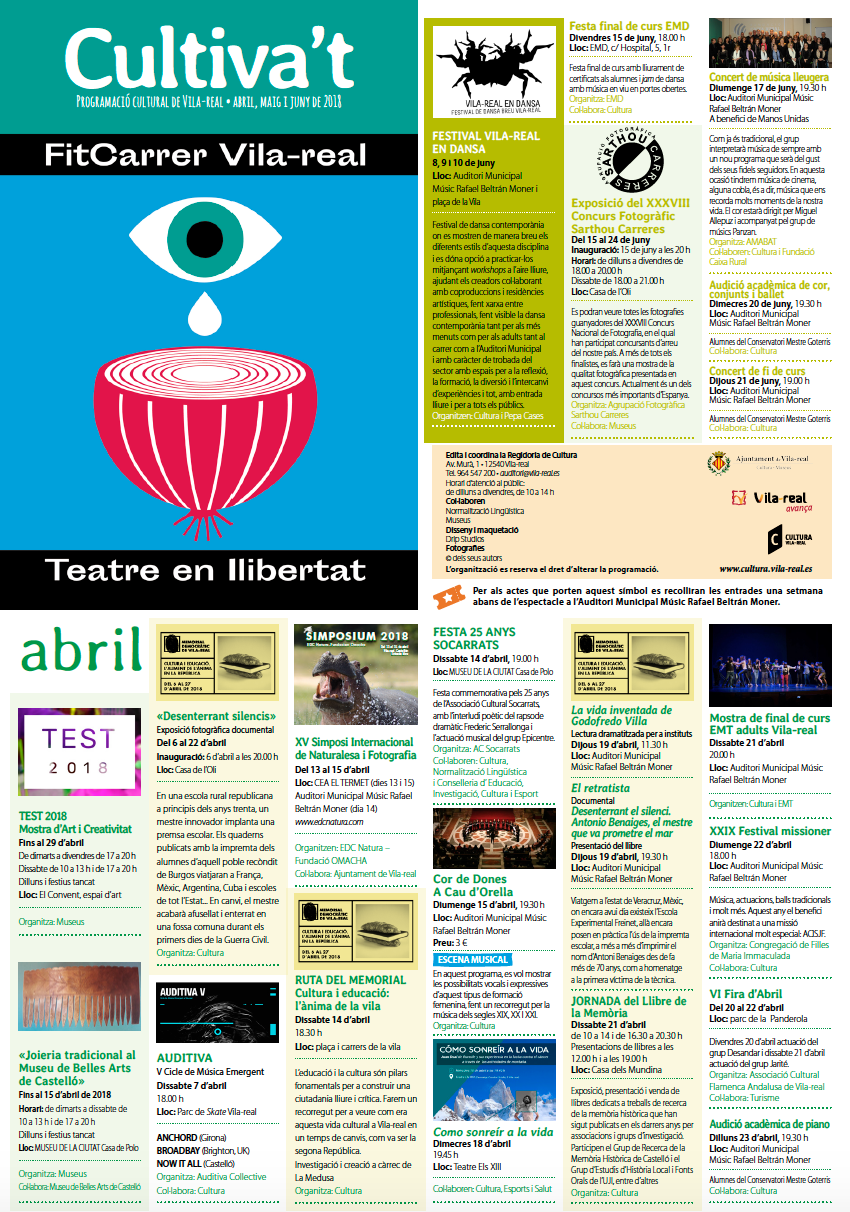 La programació cultural del segon trimestre de l'any arriba carregada d’activitats a Vila-real. Concretament, seran prop de 60 els actes programats per als mesos d'abril, maig i juny, on no faltaran les exposicions, concerts i audicions, una nova edició del Memorial Democràtic, conferències, esdeveniments d'associacions locals i dos dels festivals estrella de la ciutat: Vila-real en Dansa i el FITCarrer, que compleix 31 anys traient el teatre als carrers de la ciutat.