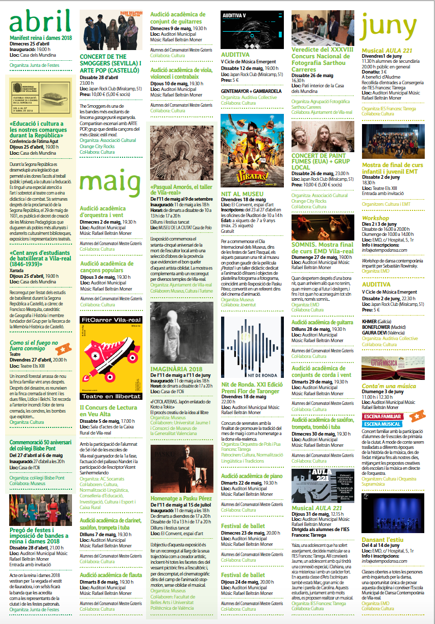 De l'11 de maig al 9 de setembre la Casa de Polo acull l'exposició ‘Pasqual Amorós, el taller de Vila-real’; a partir de l'11 de maig arriba a la Casa de l’Oli la mostra 'Imaginària 2018', el mateix dia que El Convent acull el treball ‘Homenatge a Pasku Pérez’, que es completa amb una ‘Nit al museu’ el 18 de maig. Un nou concert del Cicle Auditiva, la XXI Edició Premi Flor de Taronger de Nit de Ronda i noves audicions acadèmiques i un festival de ballet se sumen a altres actes com el Veredicte del XXXVIII Concurs Nacional de Fotografia Sarthou Carreres, el concert de Paint Fumes i un grup local en la sala Japan, la mostra final del curs de l’Escola Municipal de Dansa, Somnis, l'II Concurs de lectura en veu alta, o el musical ‘Aula 221’, que tancarà el mes, no sense abans celebrar l'edició 31 del FITCarrer, que tindrà lloc del 4 al 6 de maig.