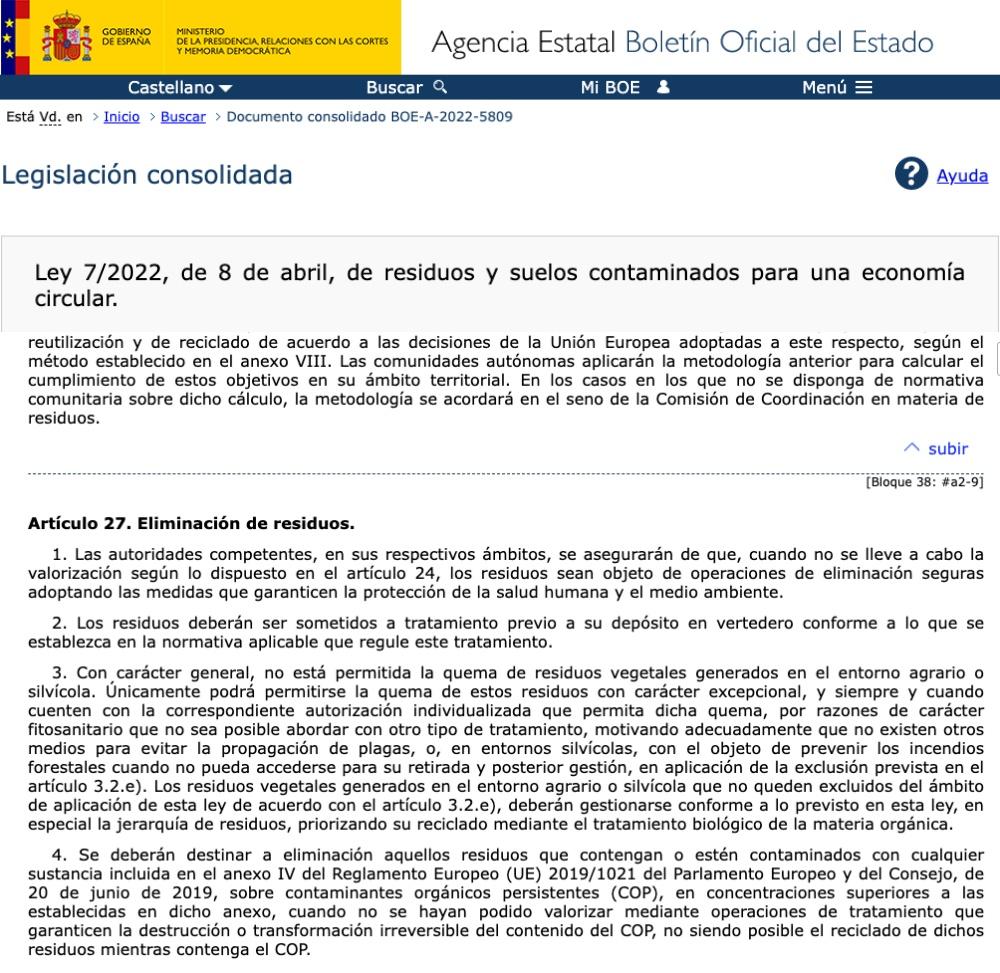 “Con carácter general, no está permitida la quema de residuos vegetales generados en el entorno agrario o silvícola. Únicamente podrá permitirse la quema de estos residuos con carácter excepcional, y siempre y cuando cuenten con la correspondiente autorización individualizada que permita dicha quema, por razones de carácter fitosanitario que no sea posible abordar con otro tipo de tratamiento, motivando adecuadamente que no existen otros medios para evitar la propagación de plagas, o, en entornos silvícolas, con el objeto de prevenir los incendios forestales cuando no pueda accederse para su retirada y posterior gestión, en aplicación de la exclusión prevista en el artículo 3.2.e). Los residuos vegetales generados en el entorno agrario o silvícola que no queden excluidos del ámbito de aplicación de esta ley de acuerdo con el artículo 3.2.e), deberán gestionarse conforme a lo previsto en esta ley, en especial la jerarquía de residuos, priorizando su reciclado mediante el tratamiento biológico de la materia orgánica.”