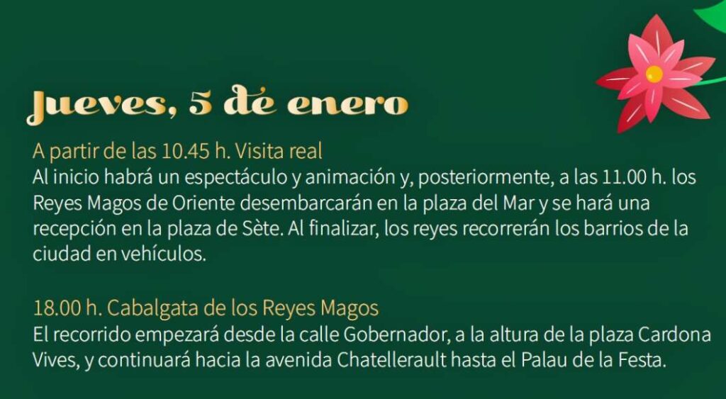 Según indica el Ayuntamiento, se realizará un espectáculo de animación a las 10:45 horas. Los Reyes desembarcarán a las 11:00 de la mañana en la Plaza del Mar y posteriormente tendrán una recepción en la Plaza de Sète, en el muelle de Costa antes de subir en vehículos que recorrerán las calles de la ciudad.