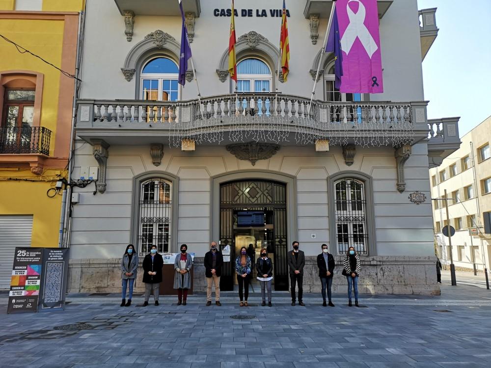 La Vall d'Uixó se ha unido a esta conmemoración con un minuto de silencio en memoria de las 40 mujeres asesinadas este año y colgando un lazo blanco desde la balconada del ayuntamiento.