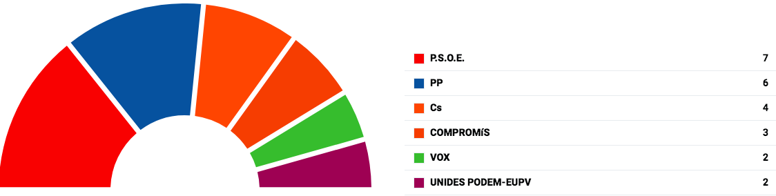 Los socialistas vencen en la provincia de Castellón y consiguen 7 diputados, 6 el PP, 4 Ciudadanos, 4 Compromís, 2 VOX y Unides Podem 2.