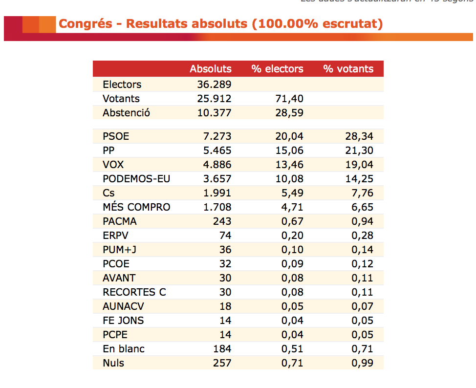 Peu que fa al Senat, les resultats han variat un poc, ja que encara que les socialistes han obtés la majoria dels vots i el PP ha quedat segon, en tercera posició està Podem, en quarta Cs, en cinquena Més Compromís i en sisena Vox.