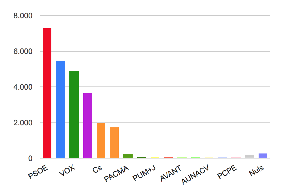 En comparació al 28A, el PSOE ha baixat prop de dos punts (679 vots menys) el PP ha pujat quatre punts i passa de ser tercer a segon (852 vots més) i la tercera posició ha sigut per a Vox (1.645 vots més), que ascendeix des del cinqué lloc, la pujada més rellevant. Podem es manté en la quarta posició i baixa en nombre de vots. Cs ha sigut per contra la baixada més forta, passant de la segona posició a la quinta i passant de 4.797 a 1.991, 2.206 menys i Més Compromís es manté en sisena posició i puja 221 vots.