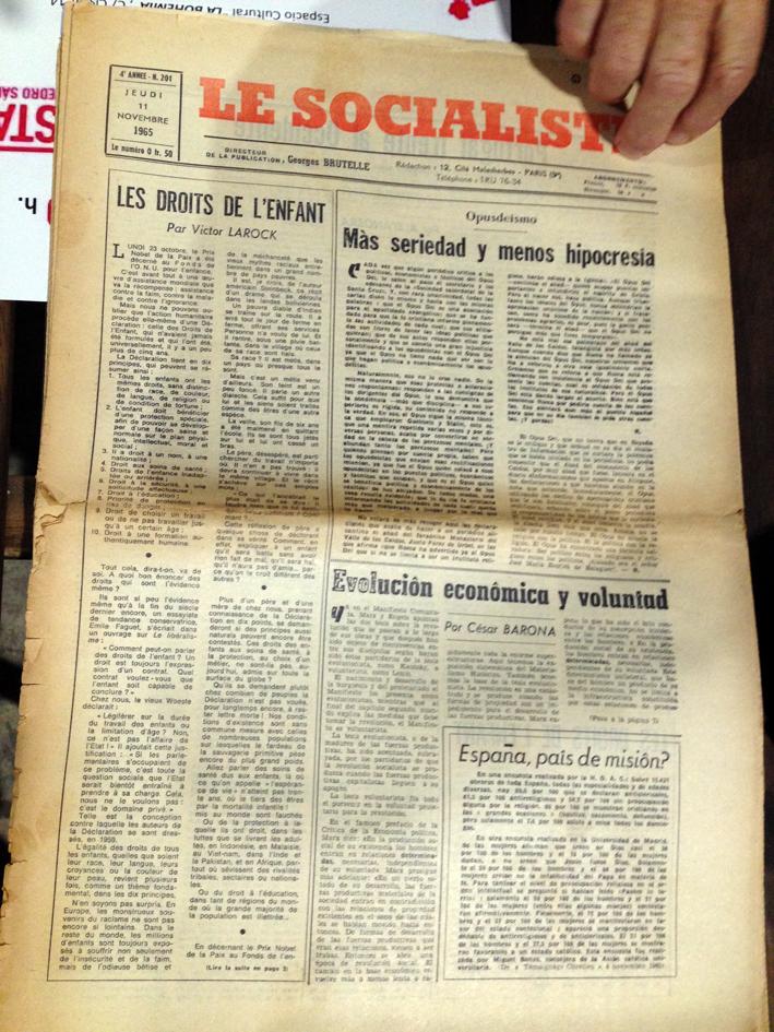 Le Socialiste 1965 (7)Pero la imagen era tierna, mucho, sobre todo para los nostálgicos, para los mayores, para aquellos que, al cabo de los años siguen abonados a  su  PSOE de toda la vida, el de antes del 79. Muchos, mucha, mucha gente mayor… matrimonios cogidos del brazo para participar del momento, un señor que llevaba bajo el brazo varios ejemplares de ‘El socialista’ de 1965, editado en París… o quienes buscaban sillas donde las hubiere, sobre todo para sentar a ‘sus señoras’ mientras esperaban pacientemente la llegada de Sánchez.