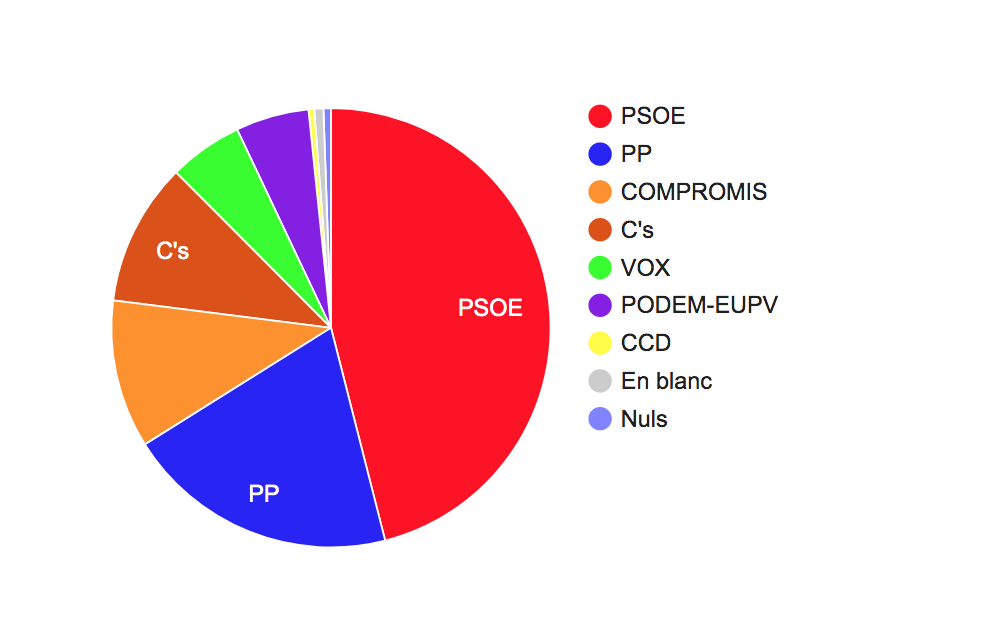 Ja des dels primers minuts s’ha evidenciat que el PSOE hi havia obtingut una holgada majoria i efectivament, amb el 30% dels vots escrutats a penes hi ha hagut canvis. Finalment els socialistes han revalidat la majoria absoluta amb 10.578 vots, el 46,28% del total. El PP, segona força, 4.610 vots (20,17%), Compromís s’ha batallat el tercer lloc quasi fins a l’últim moment amb Ciutadans i finalment ha aconseguit 2.506 vots (10,96%). Cs, quarta força, amb 2.419 vots, (10,58%) i Vox i Podem-EUPV han aconseguit un edil, els primers 1.250 vots (5,46%) i la confluència d’esquerres, 1.240 3 (5,42%). Per últim, Coalició de Centre Democràtic ha obtingut 95 vots, un 0,41%.